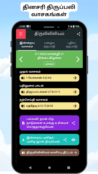 இந்த செயலியில், தினசரி பைபிள் வாசிப்பு திட்டங்கள் உங்களுக்கு கிடைக்கும்.